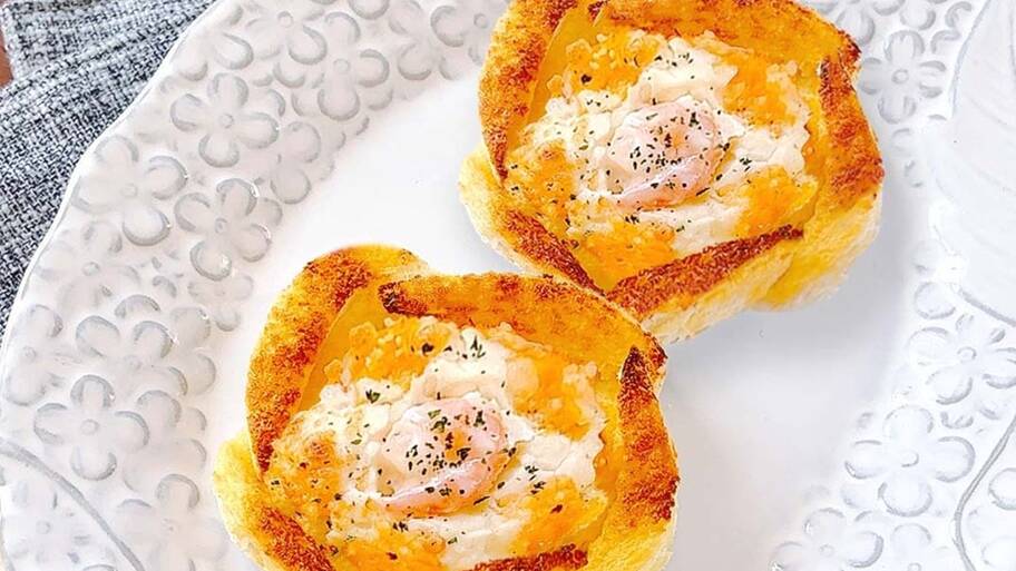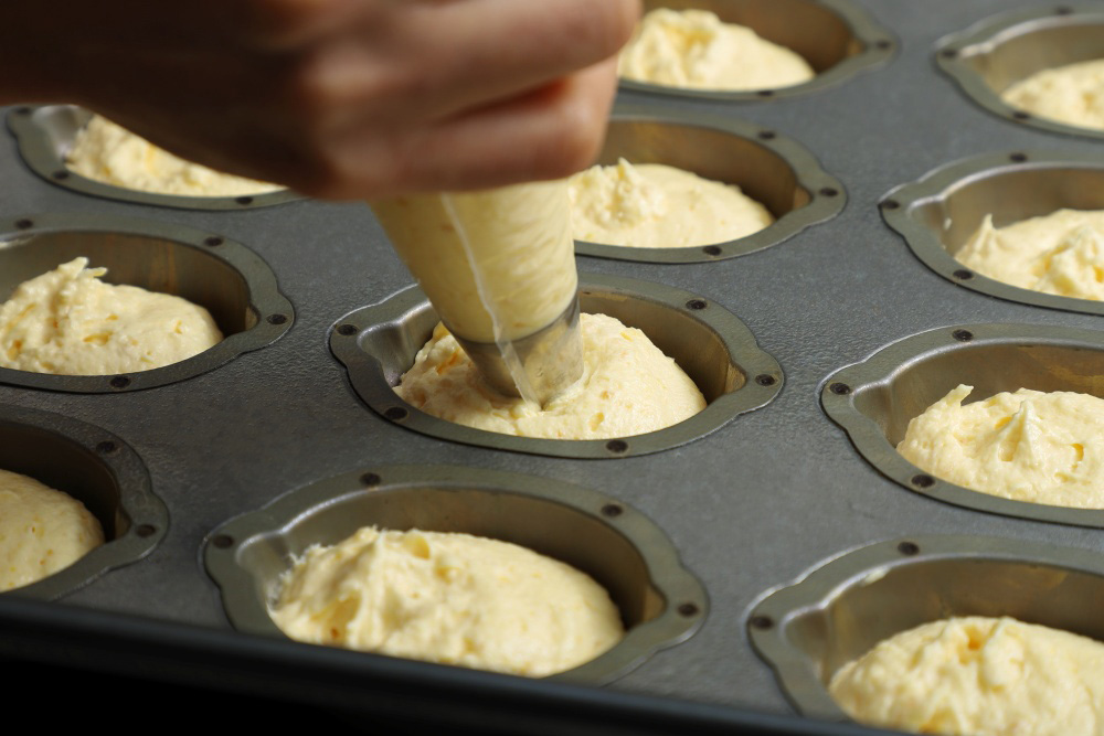 1.2cmの口金を付けた絞り袋に入れ、オイルスプレー(分量外)をした型に絞り出す。最初は5分目くらいまで入れ、最終的に8分目になるよう均等に絞り出す。