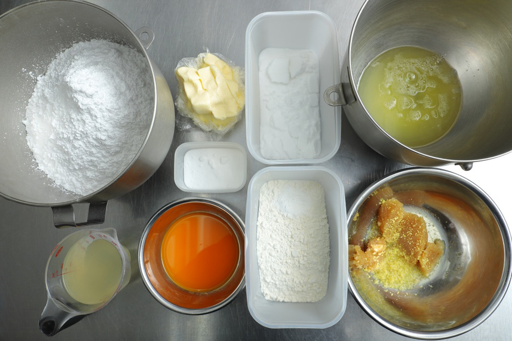 生地の構成要素は大きく分けて3つ。卵黄生地、メレンゲ、そして粉です。卵黄生地には、レモンのピールをコンフィにしたレモンミンチや果汁、皮が入ります。