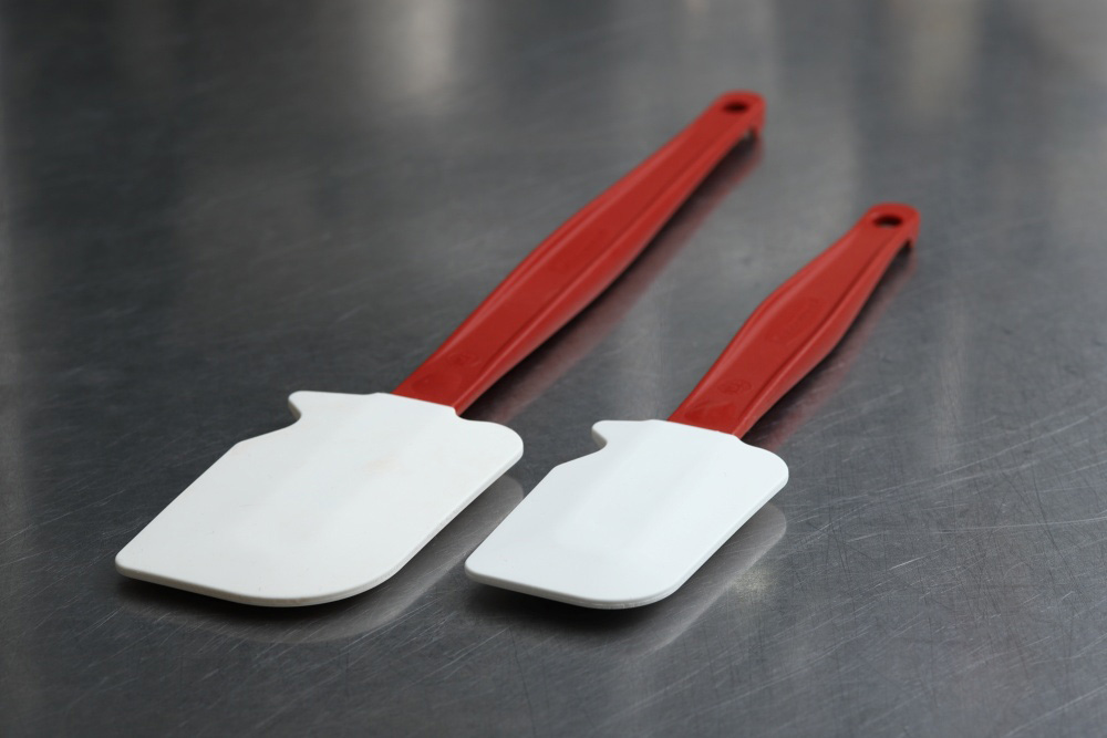 重い生地がしっかり混ぜられる。柄の先がボウルにかけられる点も便利。チョコレート仕事にも向く。