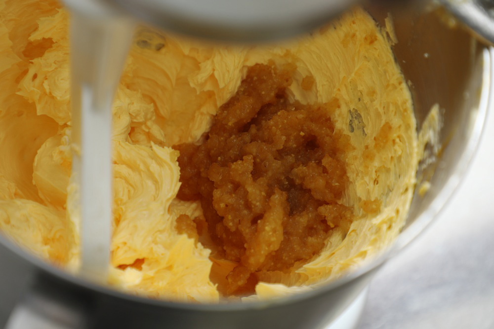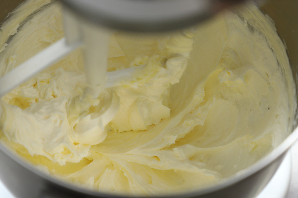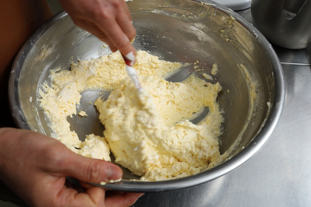 ミキサーボウルにビーターをセットし、常温にもどしたバターを低速で回す。塊が消えたらグラニュー糖を加え、低速→中低速で白っぽくなるまで回す。