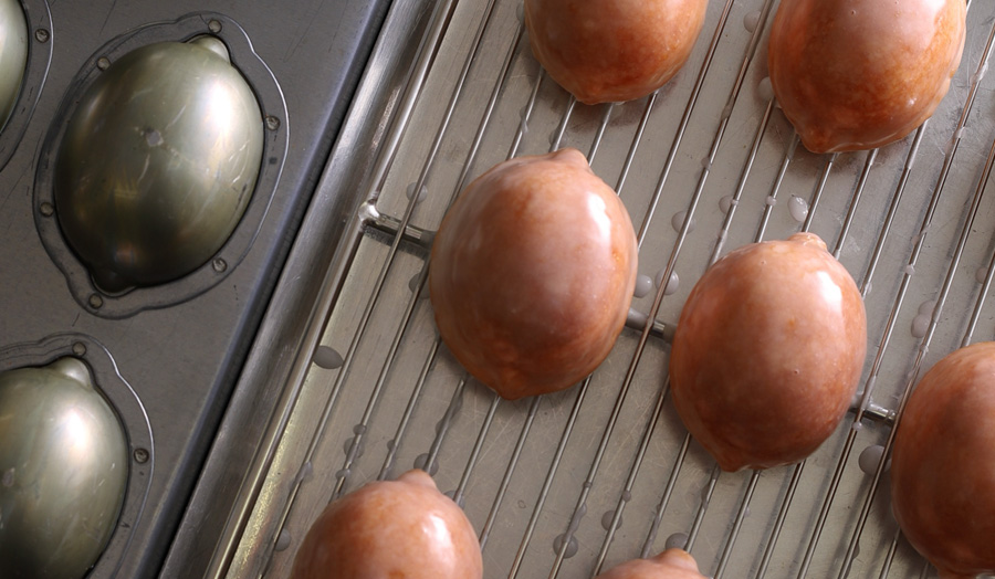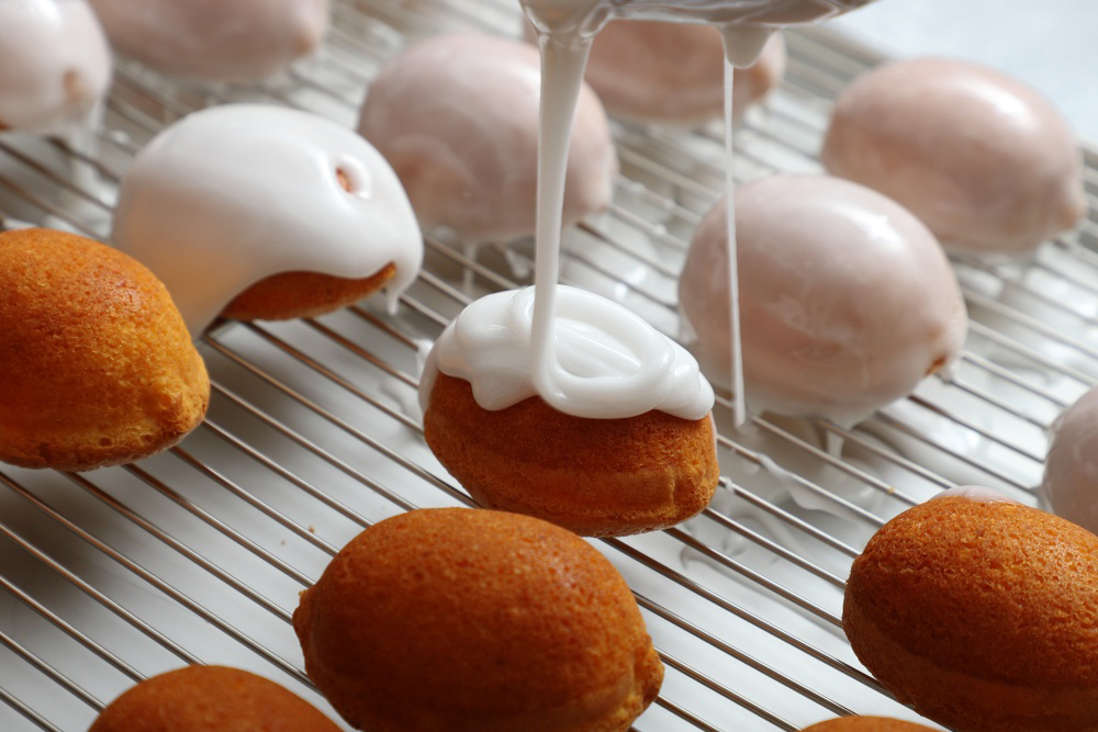 粗熱がとれたら、バットに網を重ねた上に並べ、グラッサージュをたっぷりかける。100~160℃のオーブンで1分乾かす。