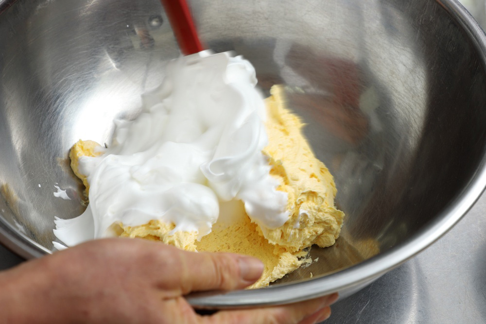 残りのメレンゲを加え、今度は泡をなるべく潰さないよう、メレンゲの白い跡がなくなるまで底からすくい上げて混ぜる。