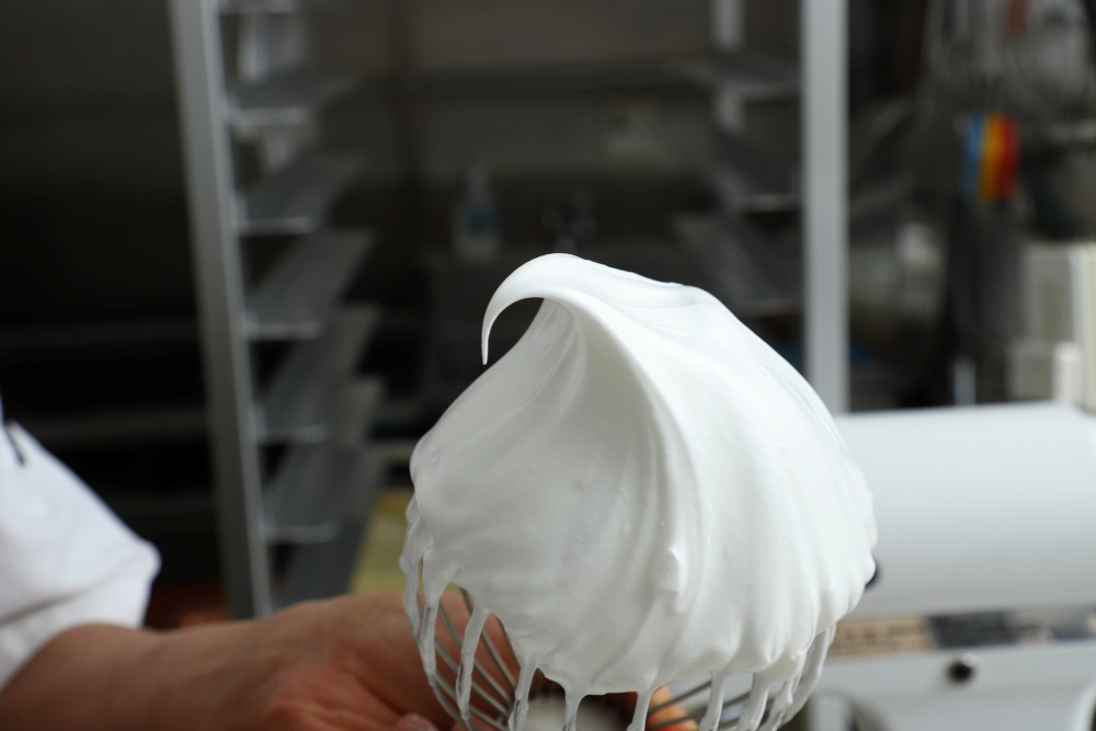 別のボウルで、中高速のホイッパーで卵白を泡立てる。全体が白っぽい泡になったらグラニュー糖を振り入れ、さらに混ぜて8分立てにする。