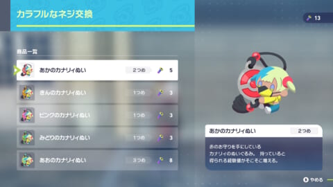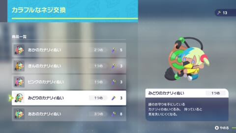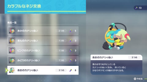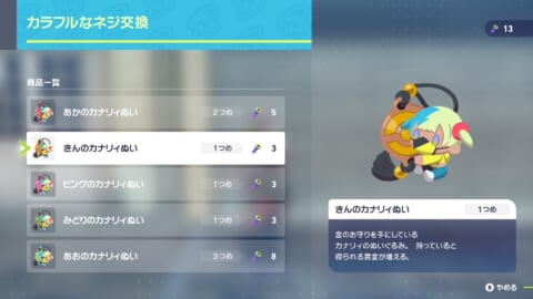 カナリィぬいは、ミアレシティの至る所に落ちているカラフルなネジを必要な個数集めることで交換できるようになります。