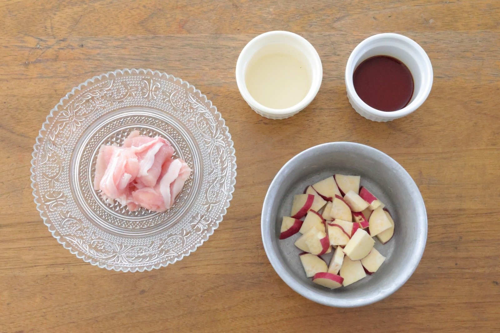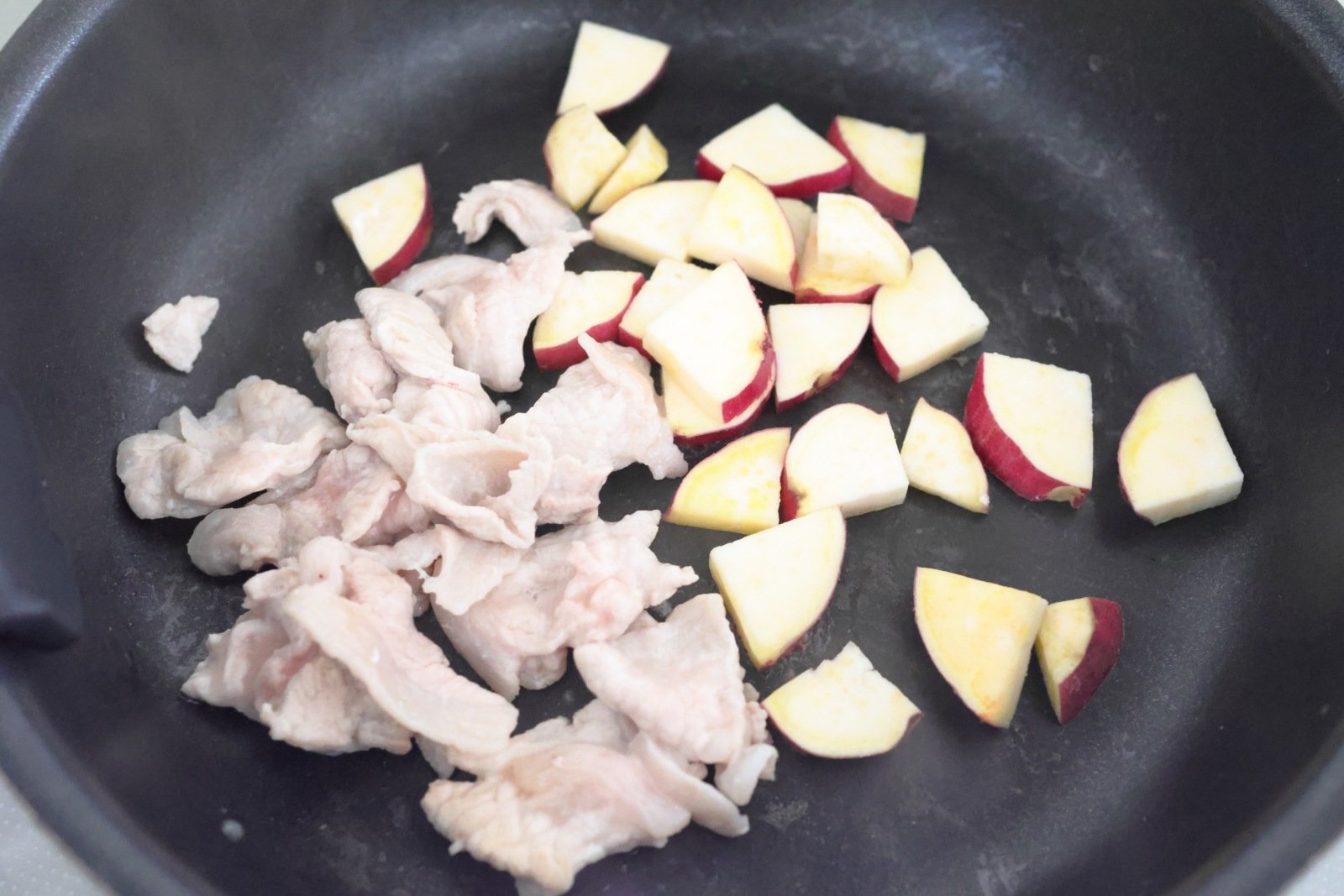 1.フライパンに油(分量外)をひき、豚肉とさつまいもを炒め、しょうゆとみりんで味つけします。
