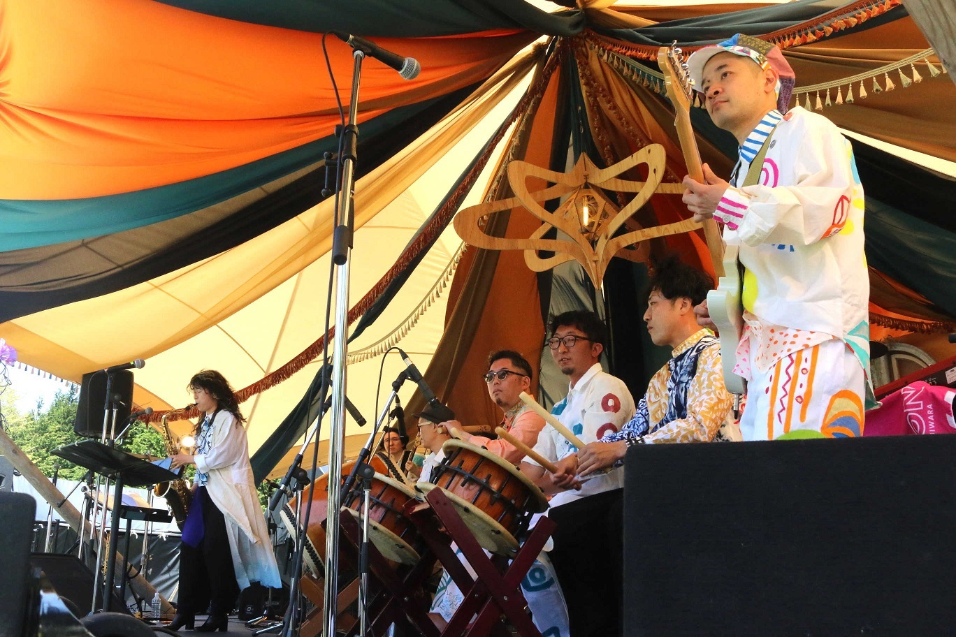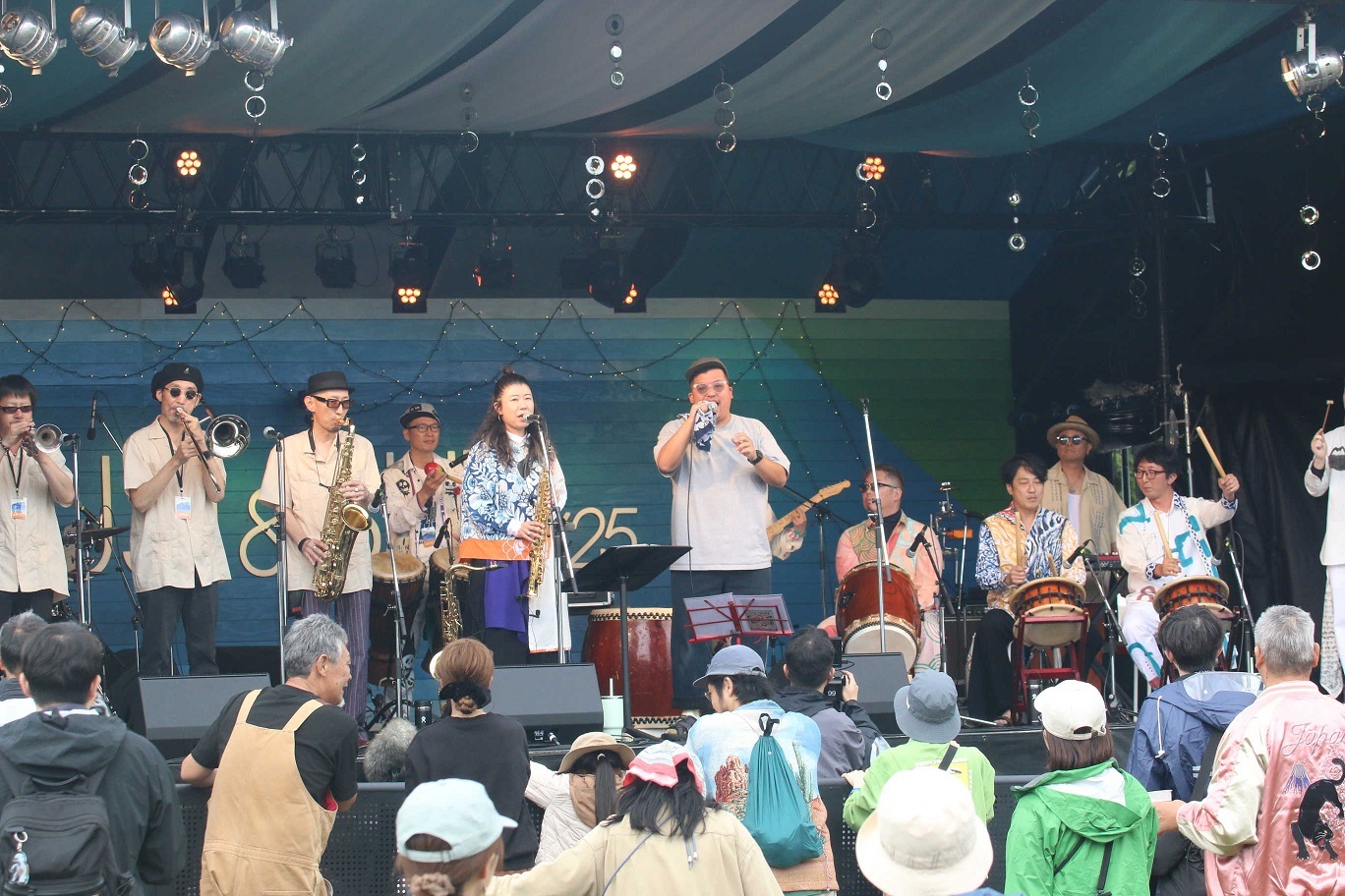 yas:(ステージの)緞帳を閉めて互いの音が干渉しないようにして。姿が見えないので、太鼓隊はイヤホンでドラムとベースの音をもらいながら演奏しました。