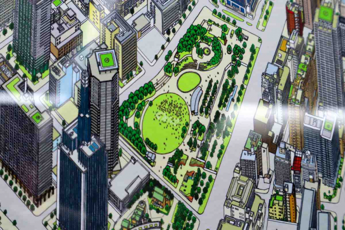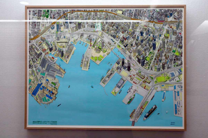 「三宮・花時計前駅」には、鳥観図絵師・青山大介さんの作品を展示。その名も「みなと神戸バーズアイマップ 2025 1.17特別版」で、2025年1月17日に空や地上から撮影した神戸の資料写真や、google mapの情報などをもとに描かれているのだそう。