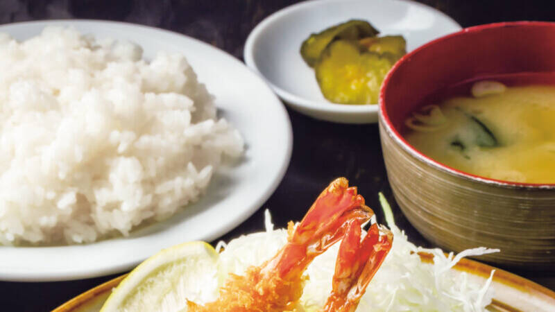 エビフライにはレモン、タルタルソースが添えられ、サクサク衣。