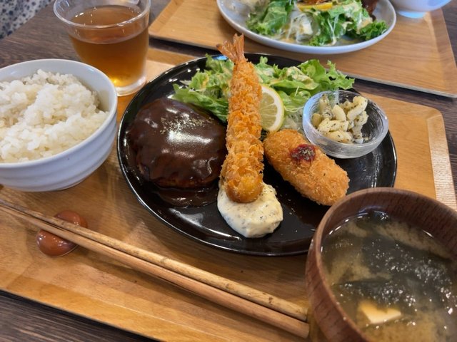 で、しばらくして木のプレートに乗った洋食定食がこちら。