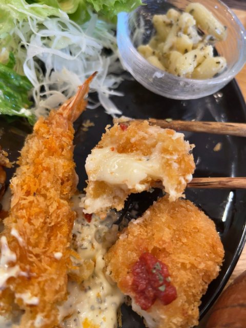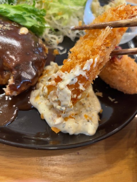 メインの洋食には手づくりハンバーグ、エビフライ、クリームコロッケ、マカロニ&グリーンサラダが付け合わせに。