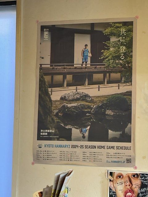店内には、すぐ近くに本拠地の体育館もある地元バスケチーム・京都ハンナリーズのスケジュール表。選手と有名神社仏閣ロケーションの取り合わせがなかなか斬新でかっこよ、と。