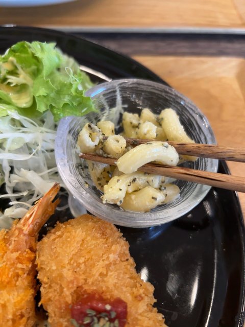 箸休めのマカロニサラダにはハーブスパイスがアクセントに。