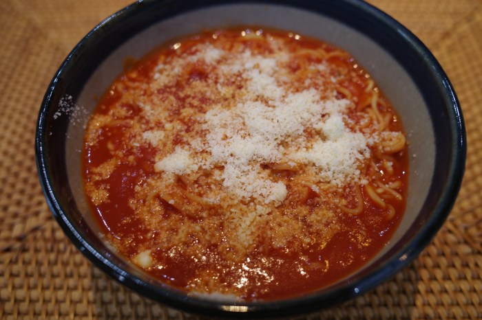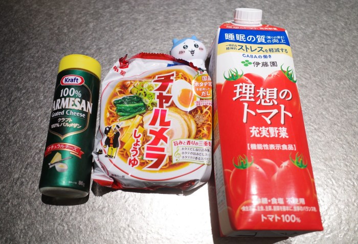 作り方は例によってとっても簡単! チャルメラの乾麺をトマトジュースと粉末スープを溶かした水で煮て、最後に粉チーズを振りかけて終わりだ。