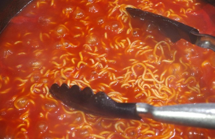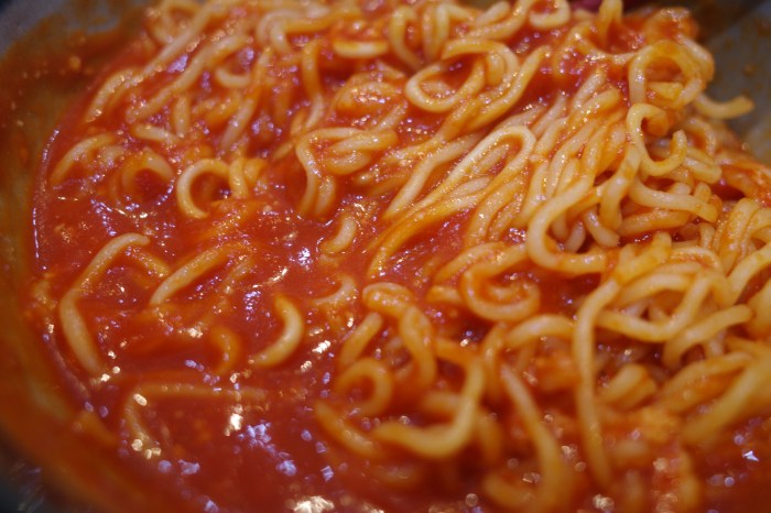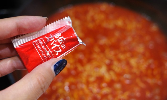 さて気になる完成形はというと、すごいのできた……。味はがっつり濃い目で、トマトが濃厚。時折香るスパイスと、みるみるうちに汁を吸って食べ応えを増していく麺。