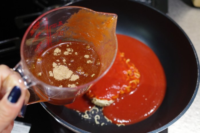 気持ちトマトジュースを多めにして、さっそく煮ていく。すぐできるだろうと思っていたが、トマトジュースが混じっているからか、普段よりも麺が若干ほぐれにくい。時折トングを使い、人力で麺をバラつかせると良いだろう。