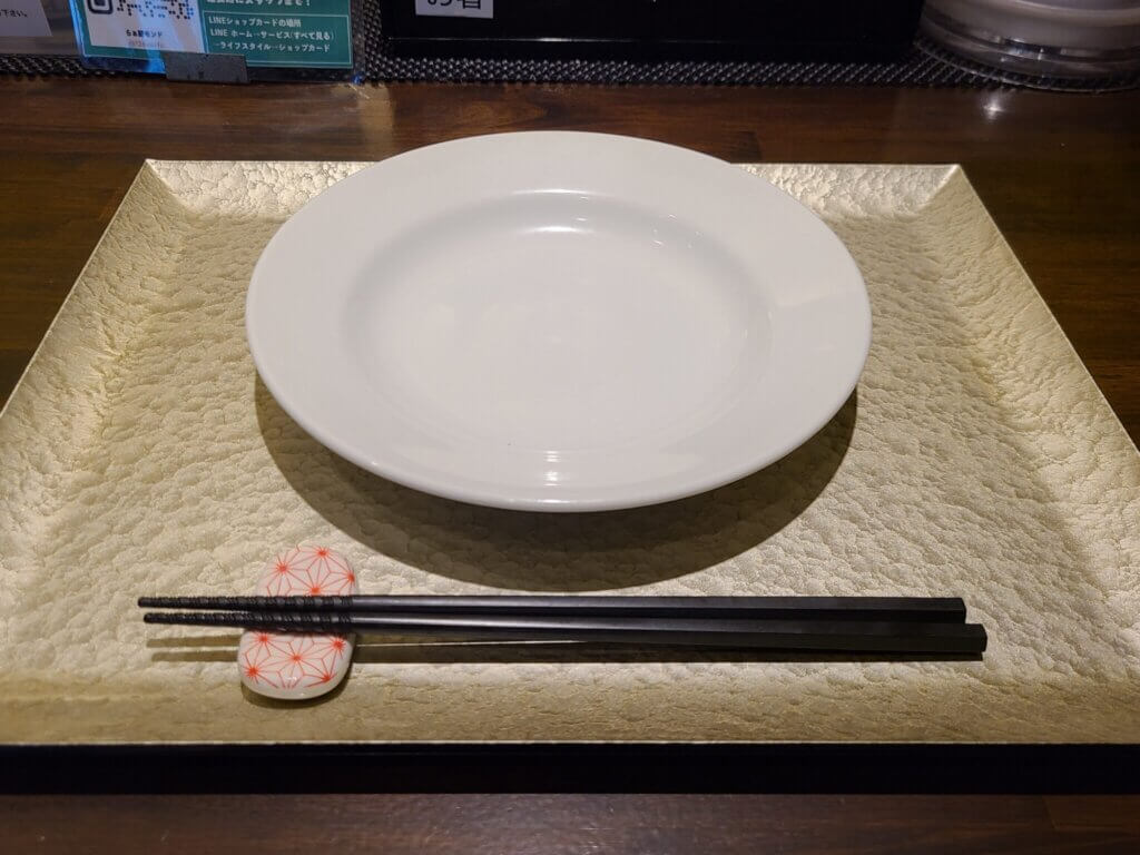 美しいおぼんと箸置き、白いお皿がセットされています。なんかもうこれだけで気分も上がりますよね。(お箸は自分でセットしました)