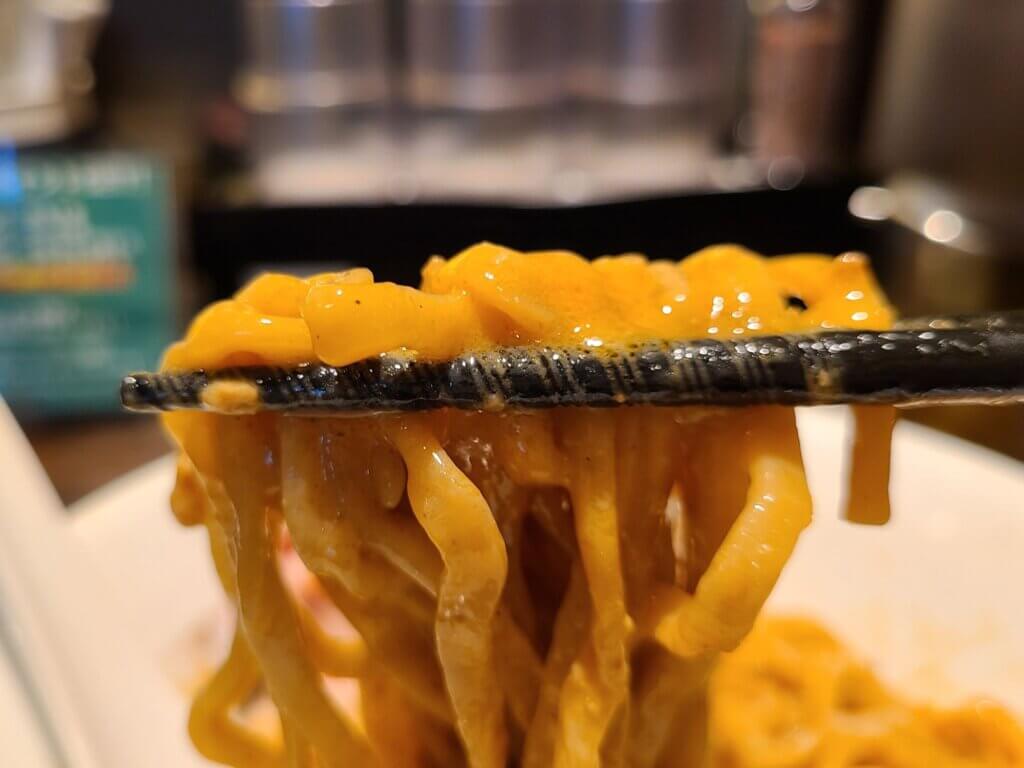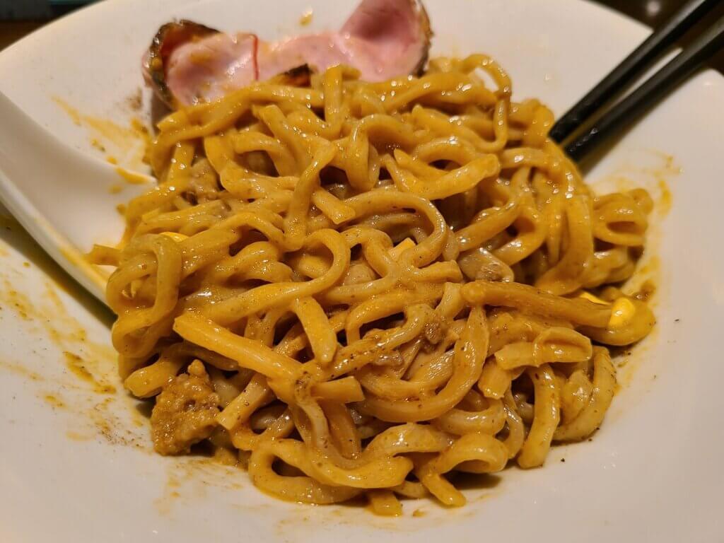 これはうまい! もちもちと食べごたえのある麺に、豆乳や味噌、唐辛子などの濃厚なうまみと香り、そして辛さが口の中に広がります。今回はニンニクを抜きましたが、ニンニクのパンチがここに加われば、さらにおいしさも高まりそう! ガンガンいける味わいですね。