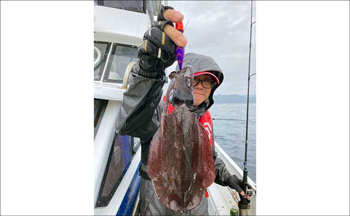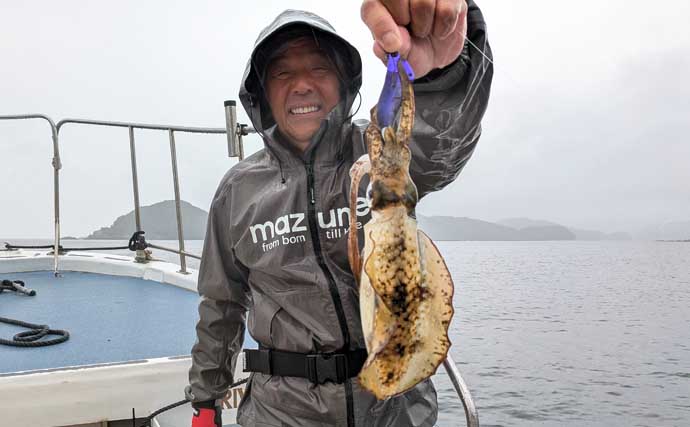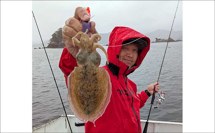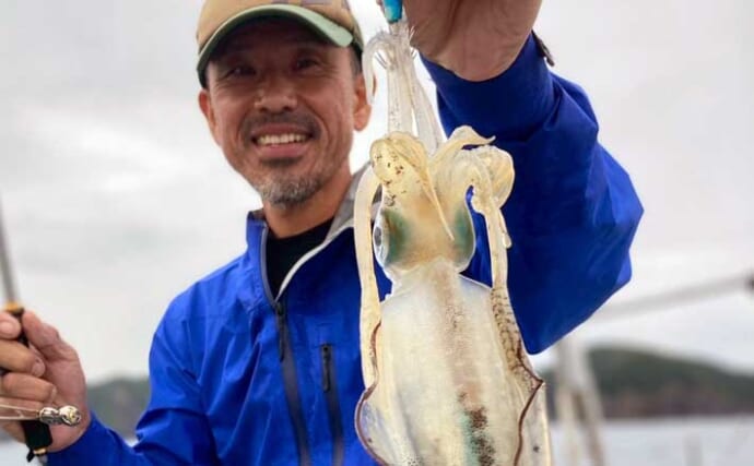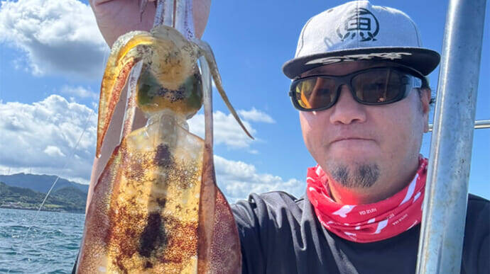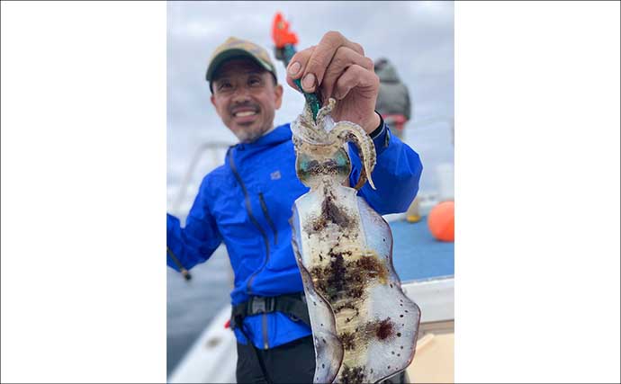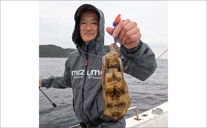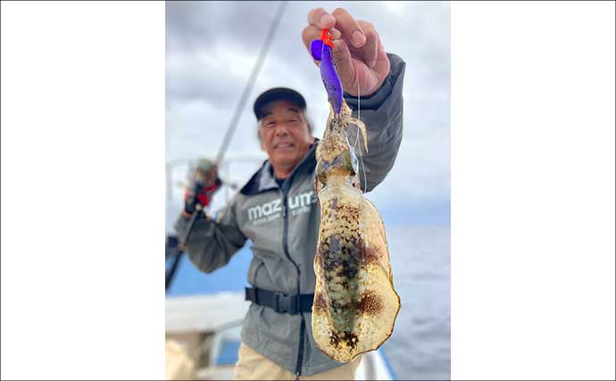 当日はウネリが残り、アオリイカの反応も単発ではあったが、谷口船長のポイント選択がハマり、船中ではまずまずの釣果となった。