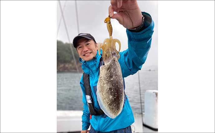 船が速く流れる場合、使用するエギを重くするかシンカーを追加して、着底を見極められるようにした方が良い。沖のポイント1流し目で、再び松尾さんにヒット。的確な状況判断で、アオリクスTR3号30gに15gのシンカーを追加してのヒットだった。