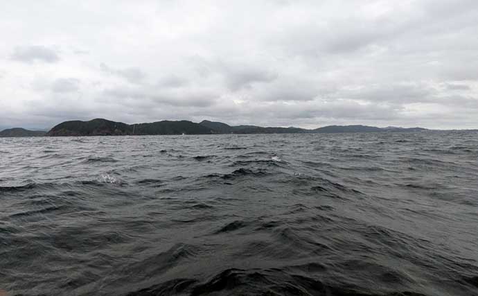 風がある方が船が流れてティップランには良いものの、釣行日当日は大雨と強風に加えてウネリもある予報となっており、グッドコンディションとは言いがたい予報。湾内のポイントが中心となることを予想しながらの出船となった。