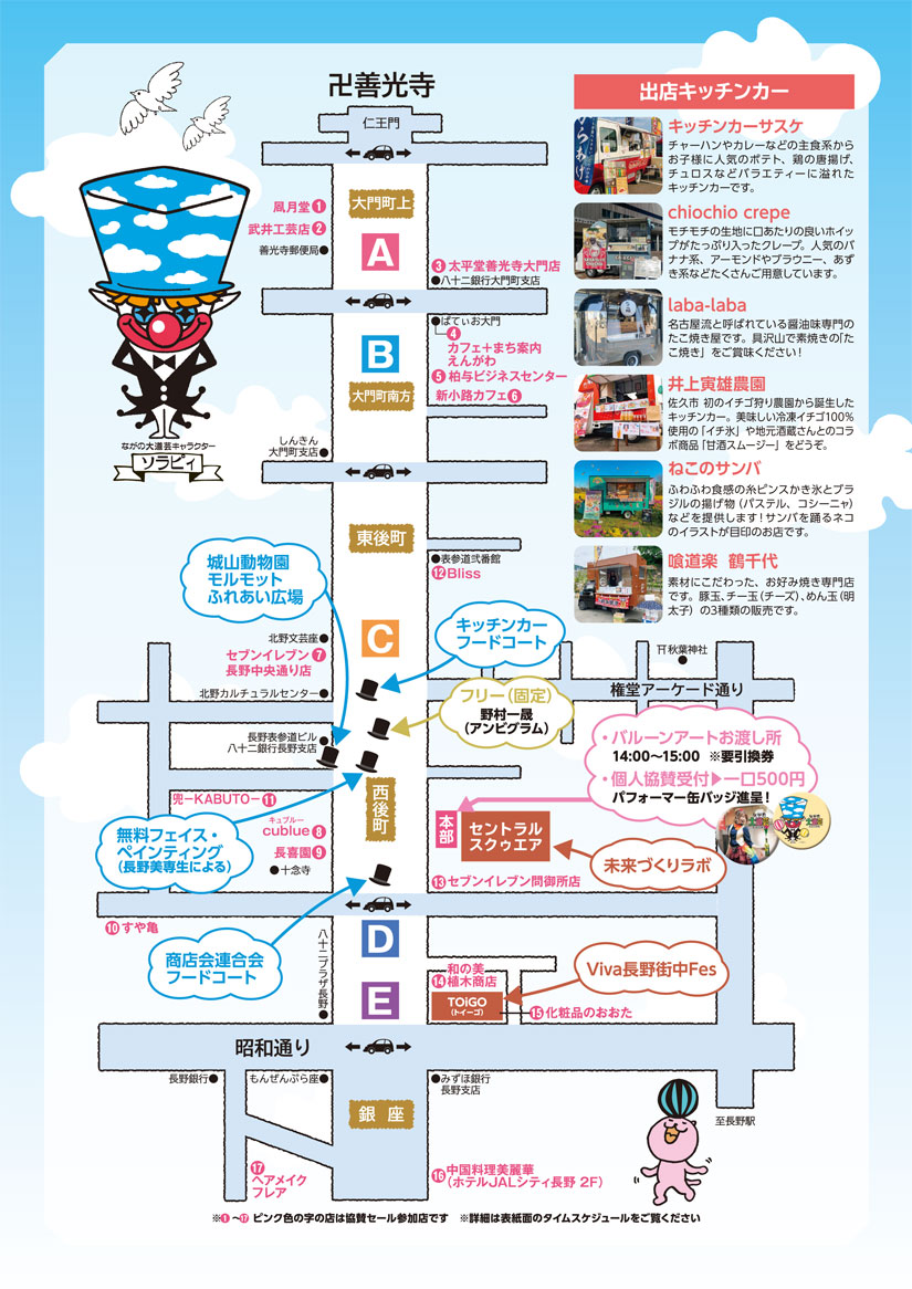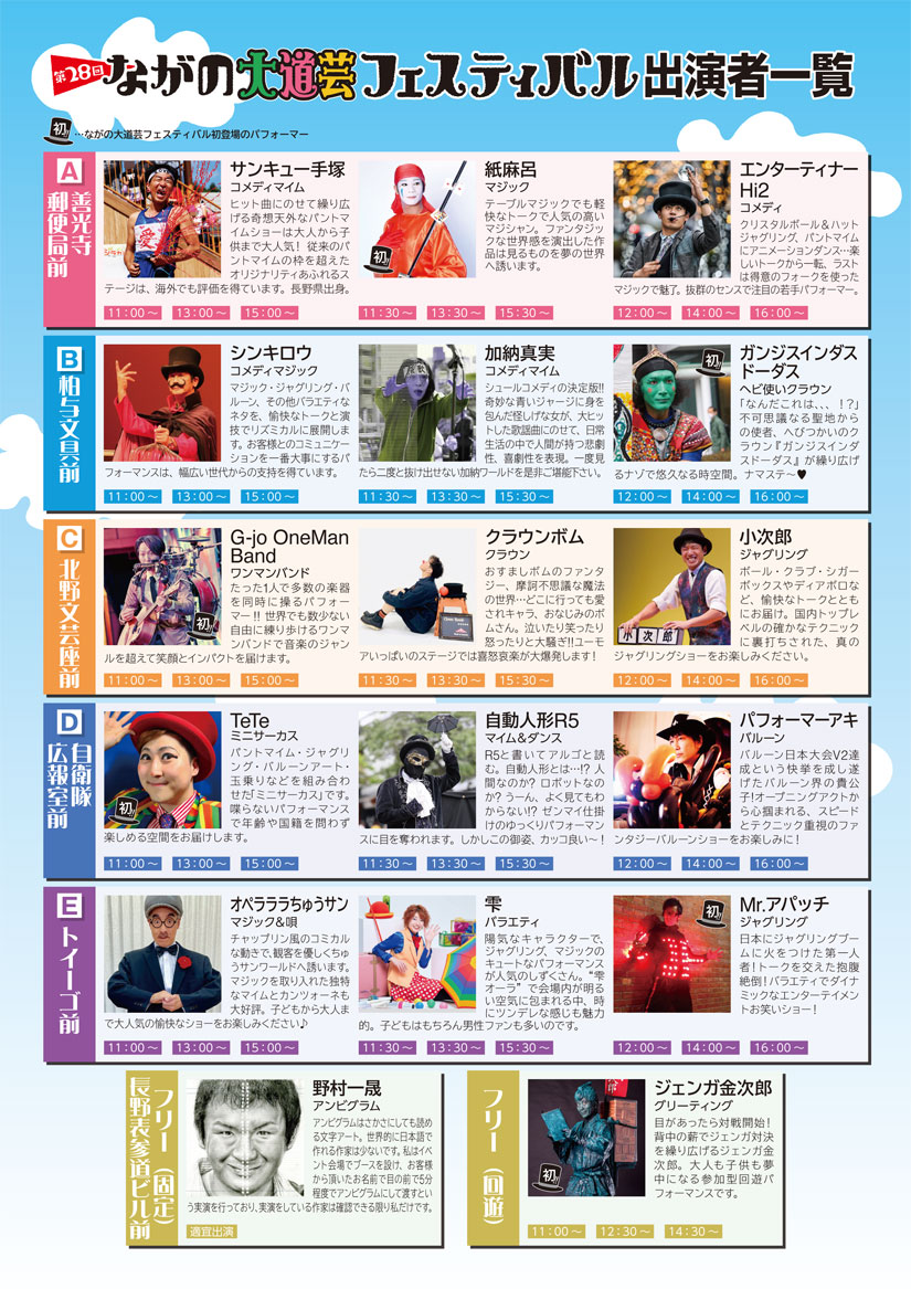 ステージは新田町交差点から善光寺交差点までの表参道に5か所設置。各ステージでは11時から16時30分まで、30分ごとに入れ替わりでパフォーマーが登場。善光寺郵便局前、柏与文具前、北野文芸座前、自衛隊広報室前、TOIGO前の5つのポイントで、同時多発的にショーが展開されます。