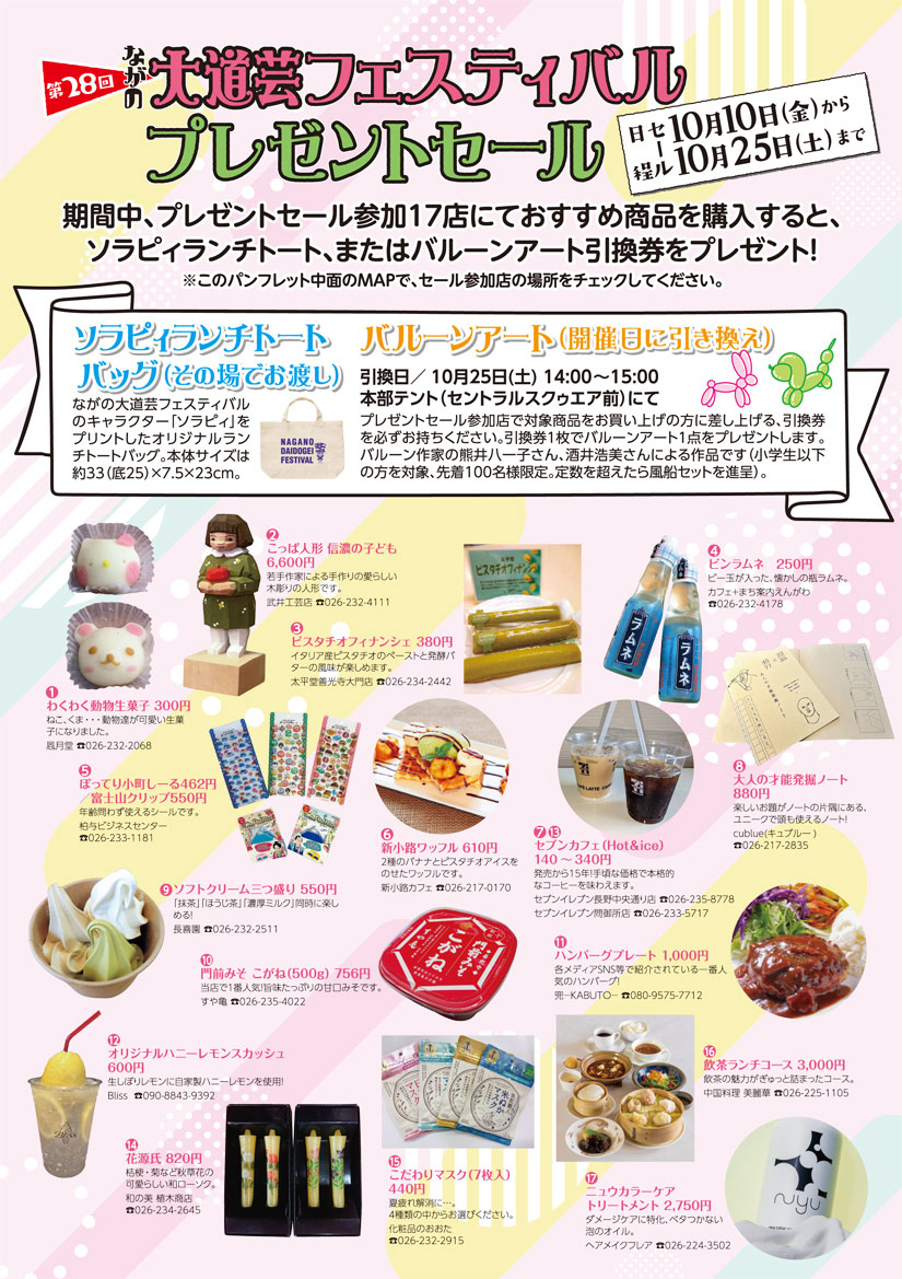 10月10日(金)から25日(土)までの期間中、17店舗でプレゼントセールを開催中。おすすめ商品を購入すると、イベントキャラクター「ソラピィ」をプリントしたオリジナルバッグ「ソラピィランチトート」、またはバルーンアート引換券がもらえます。