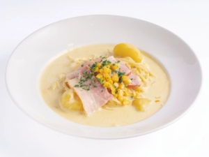 看板メニューの「ポテトベーコン」は、大きめにカットしたベーコンとポテトを合わせた特製コーンクリームスープ仕立てで、子どもから大人まで人気が高い。スープは最後まで飲み干せるように味加減を絶妙に仕上げている。チーズや辛子明太子などのトッピングを加えても楽しめる。