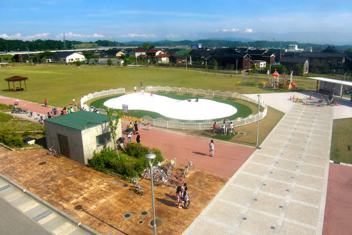 津幡町にある「あがた公園」は、広い芝生が広がり、ふわふわドームや大型複合遊具などがそろう人気の公園。
