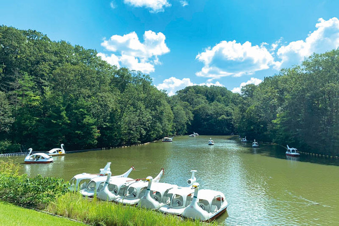 森に囲まれた大きな池では、スワンやヘリコプター、ジェット機など楽しいボード(3人乗り300円、4人乗り400円)も。