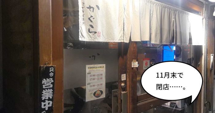 《閉店》立川のまぜそば専門店といえばのアノお店が……。立川駅南口・WINS通りぞいにある『まぜそば専門 かぐら』が11月末で閉店するみたい