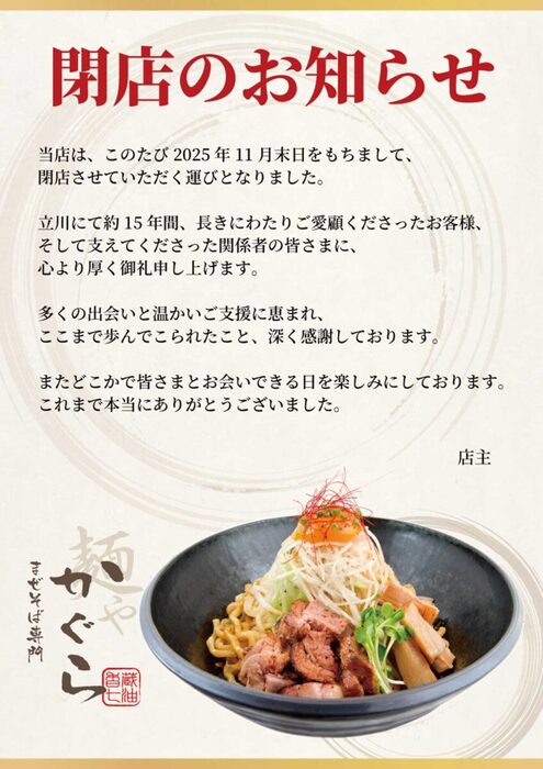 立川駅南口・WINS通りぞいにある『まぜそば専門 かぐら』が閉店するようです。