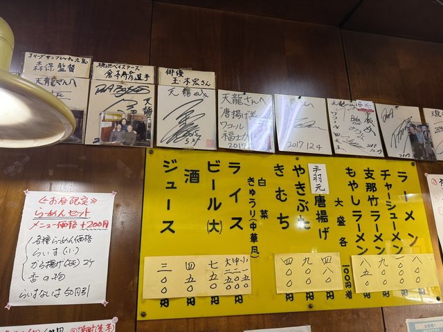 メニューは壁に掲示。豚骨醤油ラーメンのほか、特選しょうゆ、味噌、博多風などがあり、唐揚げも名物です。