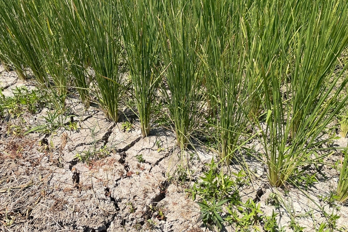 《画像:水不足で地表がひび割れた上越市内の水田》