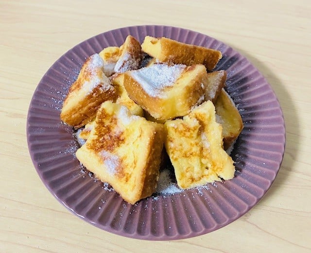 ミキサーで作った粉砂糖を、フレンチトーストにかけて食べてみました。食べてみた感想は、“粉砂糖”と“グラニュー糖よりも細かい粒”が混ざっている感じです。