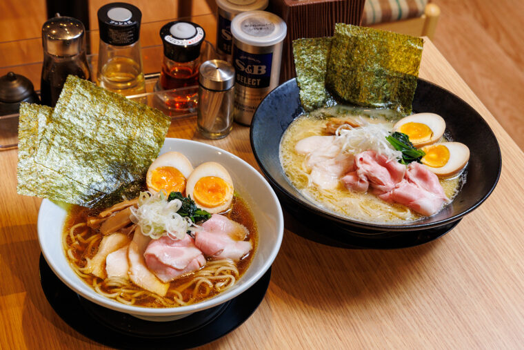 おすすめは越の鶏のチャーシューや江南区にある若月鶏卵の卵を使った味玉がのった『極鶏生姜醤油』と『極白湯塩』。