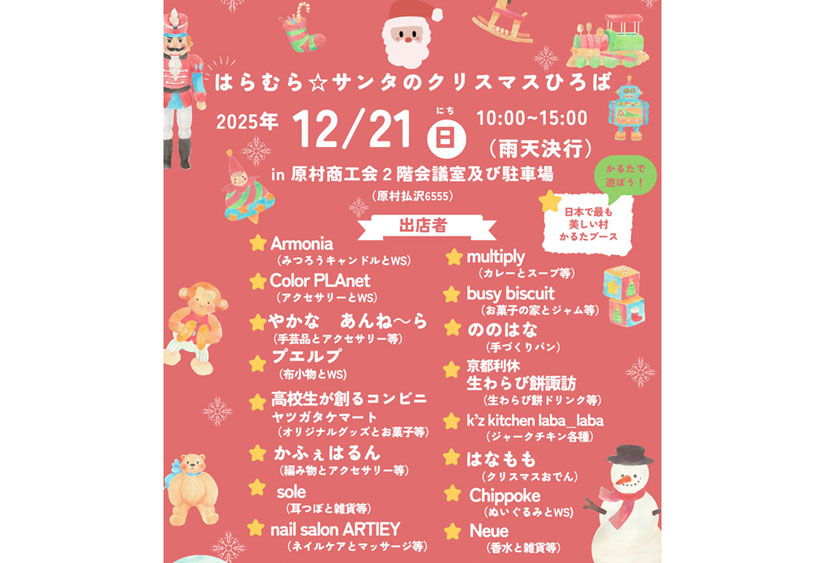 12/21(日)『はらむら☆サンタのクリスマスひろば』ヤツガタケマート・クリスマスおでん・ジャークチキンなどのお店が集結!@長野県 原村
