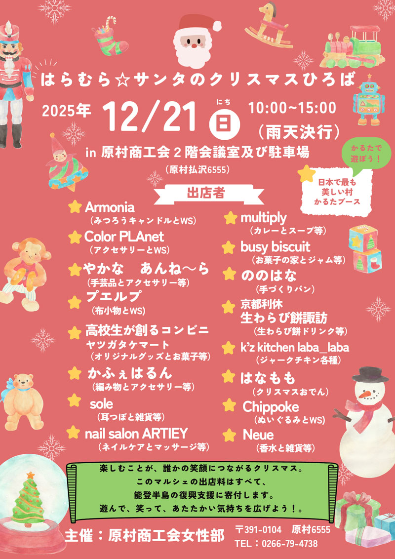 長野県の「八ヶ岳自然文化園」から車で9分ほどにある「原村商工会館」で、イベント『はらむら☆サンタのクリスマスひろば~みんなで集めたプレゼントを能登へ~』が、2025年12月21日(日)に開催。