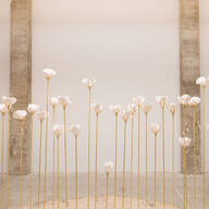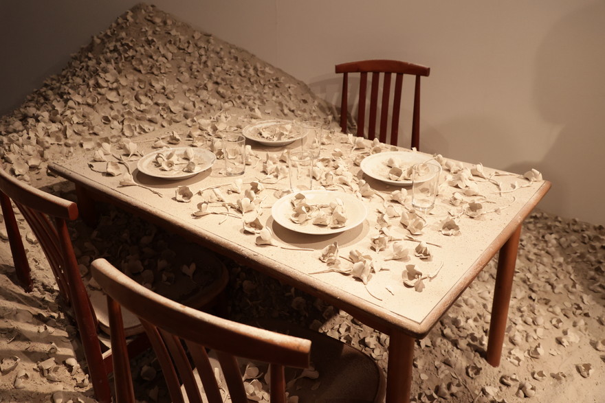 部屋中に散らばる小さな花が灰のようにも見えますね。これらは、瀬戸の土から陶土や珪砂を精製する過程で生まれる廃棄物を使って作ったのだとか。冨安さんが、世界中の紛争や戦争、対立、そして広島原爆を念頭に置いて制作したインスタレーションです。