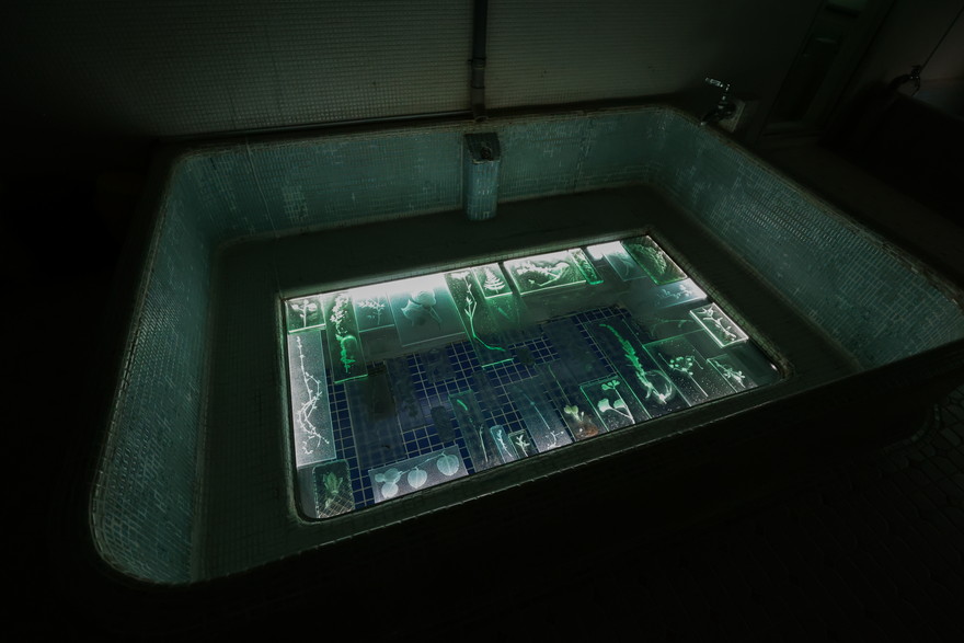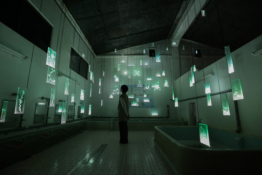 こちらでは、ガラスを用いた作品が特徴的な作家・佐々木類さんの作品を鑑賞することができます。一歩足を踏み入れれば、真っ暗な非日常的な空間へ。浴室には、地元の人たちと一緒に採取した植物を閉じ込めたガラスが散りばめられていて、幻想的な空間が広がります。さらに、湯船や桶の中にも作品が。