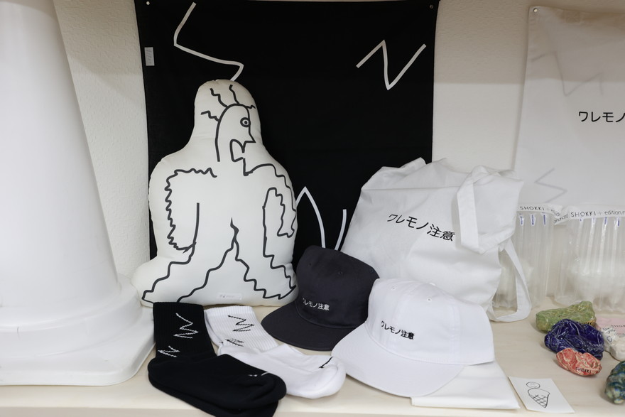 右から「ワレモノ注意SOCKS」(2980円)、「ワレモノ注意CAP」(4980円)、「ワレモノ注意TOTEBAG」(1980円)など