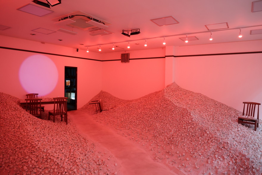 足を踏み入れれば、「灰と薔薇のあいまに」という芸術祭のテーマを思い起こさせる空間が。3分ほどの周期で移り変わる照明によって、見え方が変わっていきます。