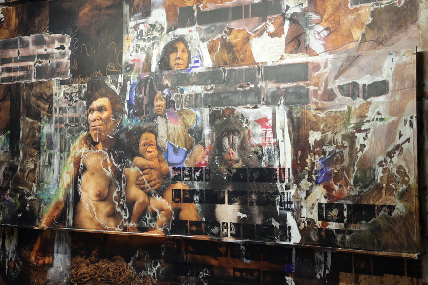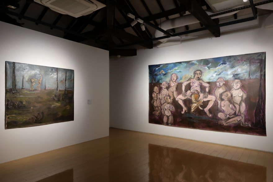 2階には、アラブ首長国連邦の作家であるメイサ・アブダラさんの連作絵画が展示されています。「誕生」「ダンス」「死」の3章仕立ての作品で、母親としての葛藤や罪悪感を、生まれてくる赤ちゃんを恐竜として描くことで表現。タイトルからは、自分らしくやっていくという意思表明も感じられます。