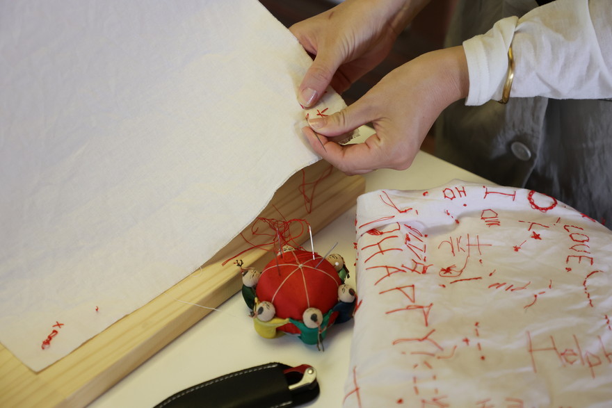 建物の中に入れば、白い布と赤い糸、針が用意されていて今の気持ちを縫い付けることができるようになっていました。これは、出征する兵士のための弾除けのお守りとして千人の女性が布に一目ずつ赤い糸を縫いつけた“千人針”を彷彿とさせます。ぜひ、今の願いや問いかけ、気持ちを残してみてください。