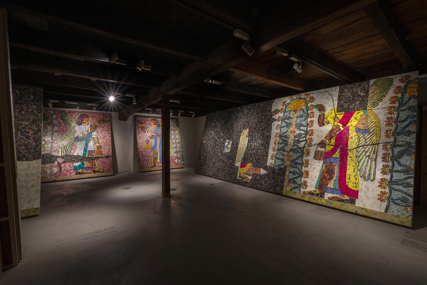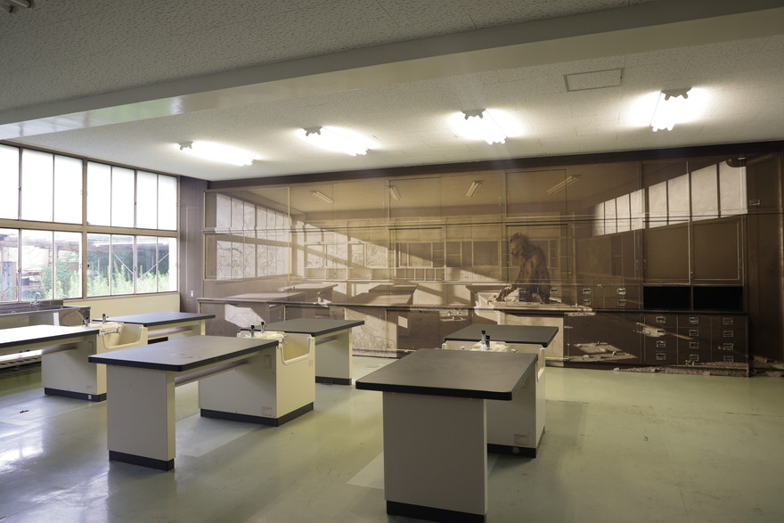 学校の面影を残しながらも、古今東西の素材を持ち寄り、壁全体を使って作品を展開。“ありえるかもしれない、私たちが今生きている次元とは違う世界”が描かれています。