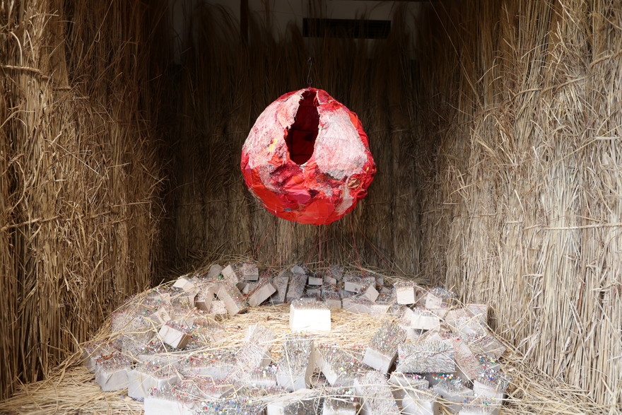 茅葺きの屋根と調和するようにワラで覆われた部屋には、天井から吊るされた赤い布のかたまりが。そこから四方八方に伸びる糸は、足下を埋め尽くす陶土につながっています。「株式会社 加仙鉱山」の粘土を使ったという陶土をよく見ると、寄贈で集められた10万本近くの針が“針供養”のように刺さっています。