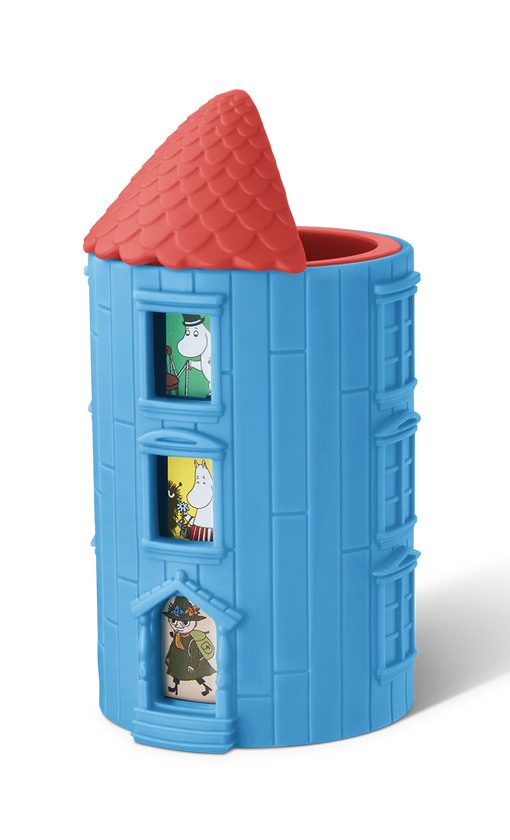 ムーミンやしきをモチーフにした鉛筆立てで、鉛筆やペンを差すことができます。屋根をくるくる回すと窓から見えるイラストが変化します。 ※鉛筆やペンはつきません。