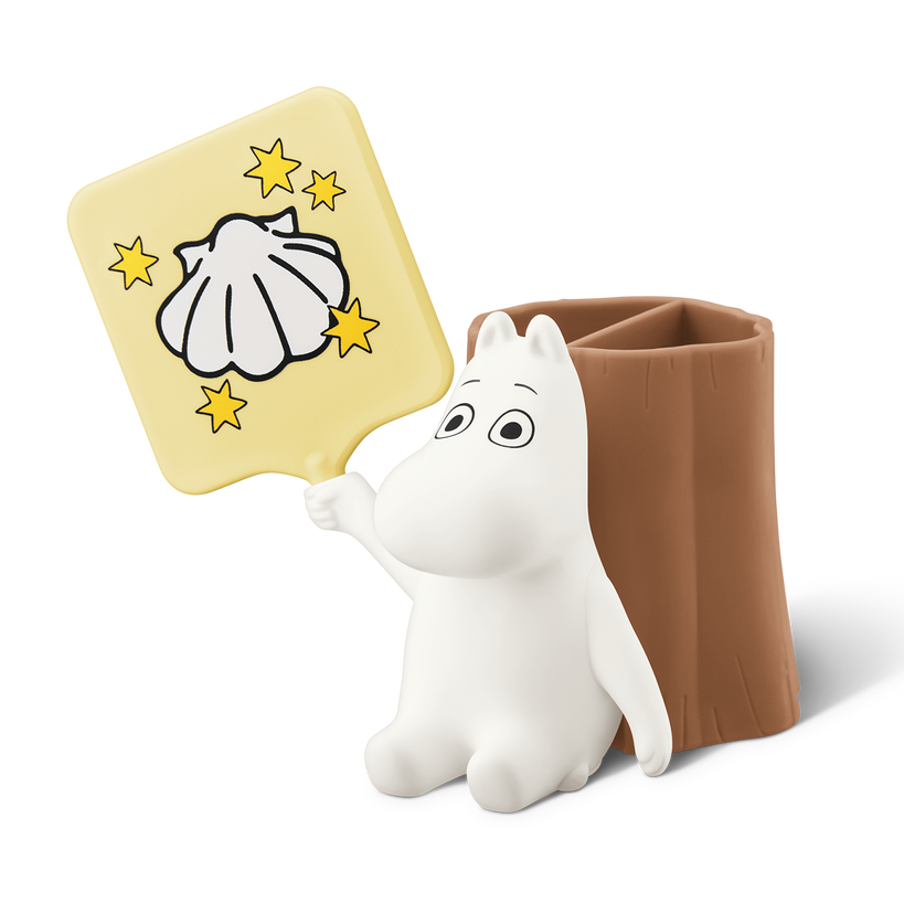 切り株の中に歯ブラシを置くことができる歯ブラシホルダー。ムーミンが持つパネルは、裏と表で2種類の貝殻の絵柄が描かれています。歯磨きができたらパネルをひっくり返して「歯磨き終了!」の目印に。歯磨き習慣が楽しく身につきそうです。 ※歯ブラシはつきません。