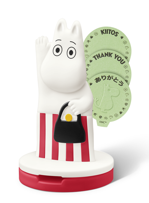 台座下の蓋に付属の紙をセットして押すと、ムーミンの絵柄が浮き出ます。付属の3枚の用紙には、3つの言語(日本語・英語・フィンランド語)で「ありがとう」が書かれています。誰かに「ありがとう」を伝える練習にどうぞ!