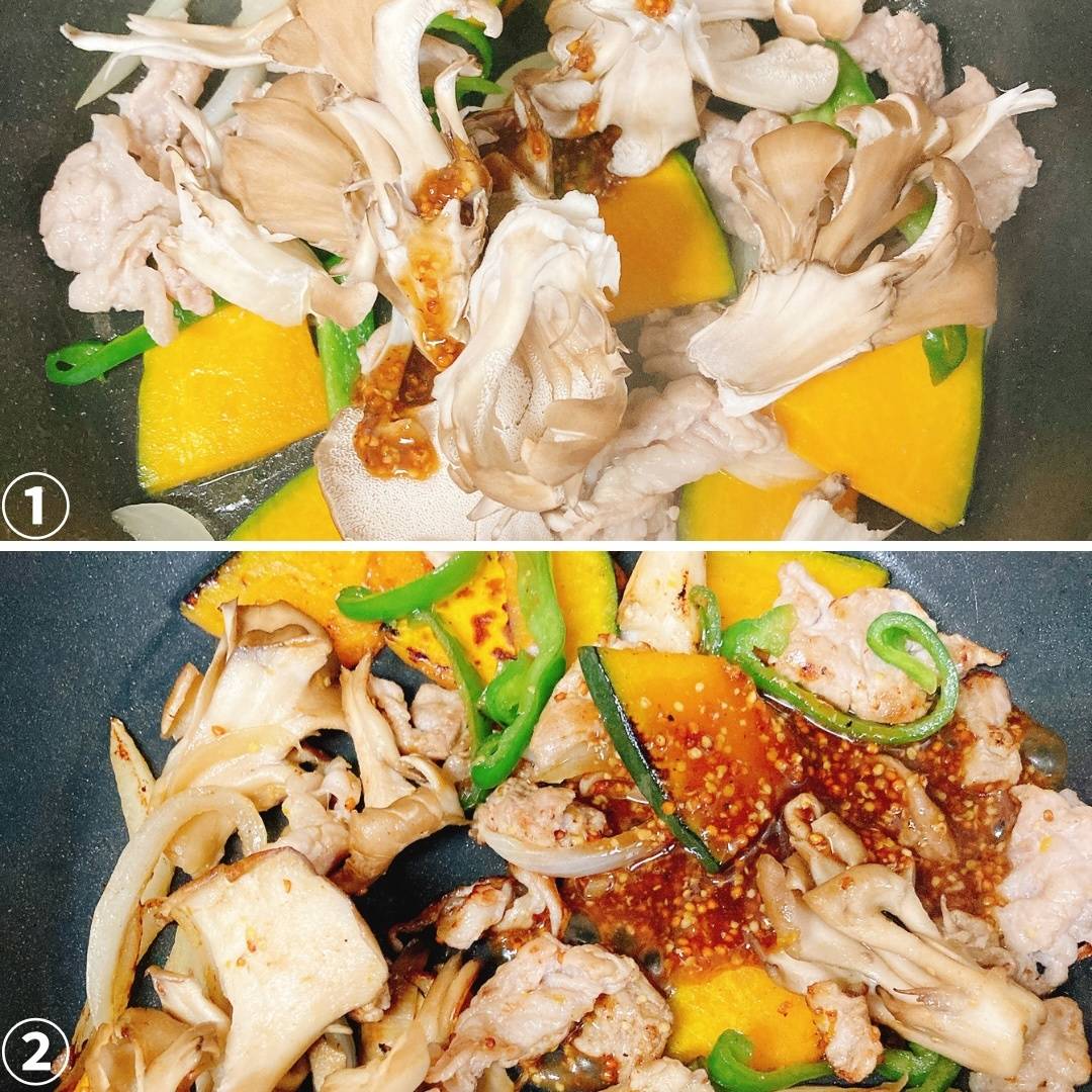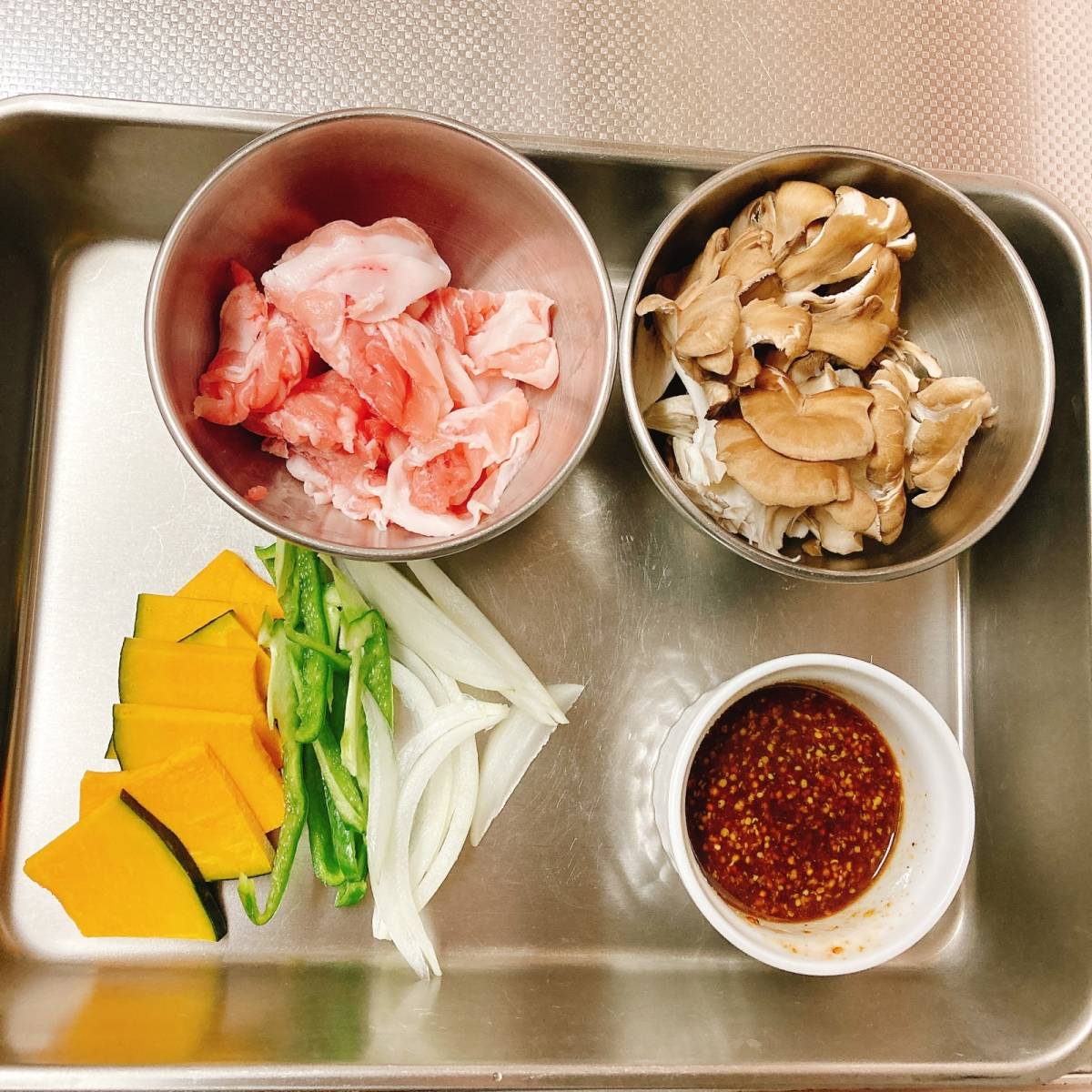ピーマンは縦に細くカット、かぼちゃは食べやすい大きさカットしてから薄くスライス、舞茸は軸を取ってほぐしましょう。