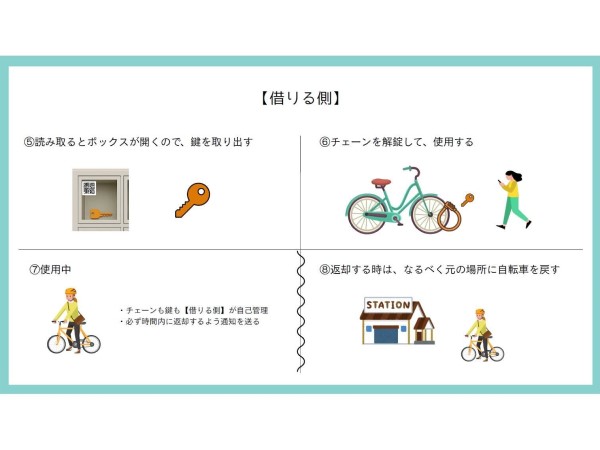 ①自転車を駅の駐輪場に置き、アプリで自分の身長や貸し出す時間などの貸出設定を行う。